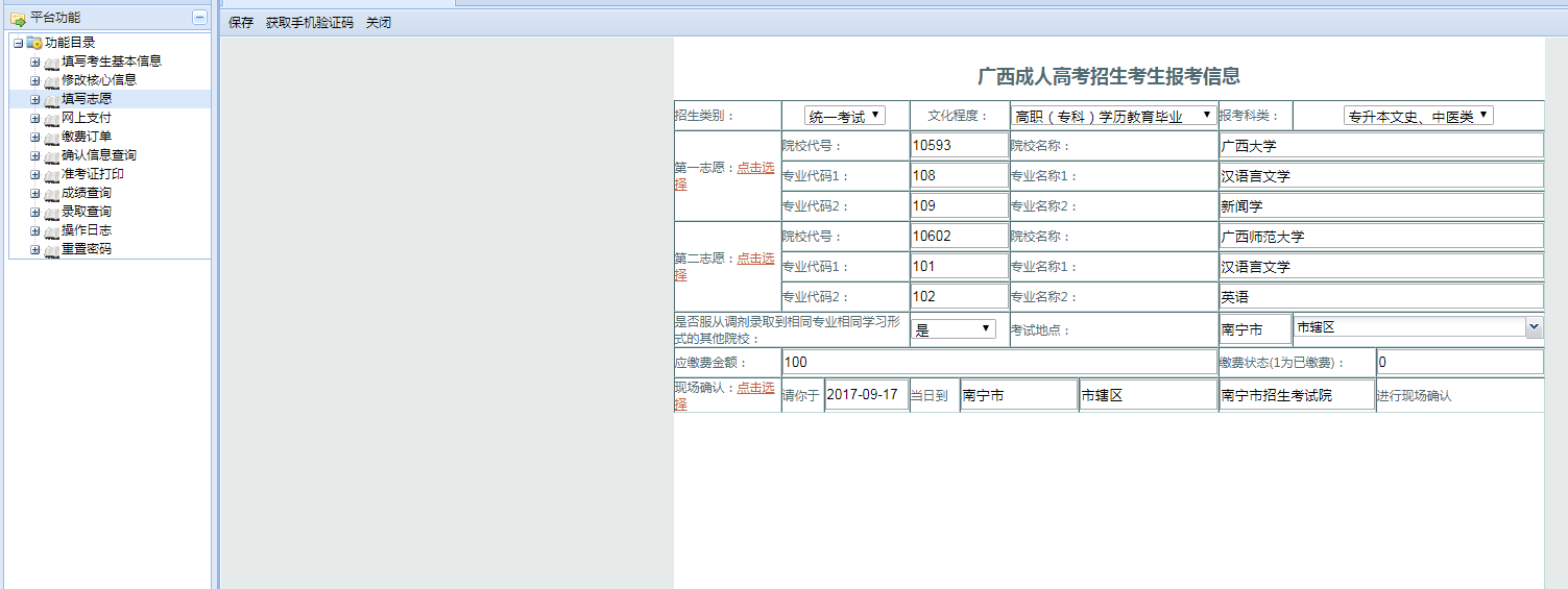 四、點(diǎn)擊“填寫志愿”按鈕,選擇招生類別、文化程度、報(bào)考科類、志愿、考區(qū)和現(xiàn)場(chǎng)確認(rèn)地點(diǎn)等信息,點(diǎn)擊左上角的“保存”按鈕。