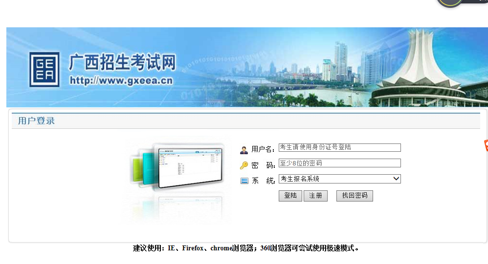 一、憑身份證號(hào)和新密碼登錄廣西招生考試院官網(wǎng)(www.gxeea.cn)的成人高考報(bào)名系統(tǒng)http://cg.gxeea.cn:8668/ckao/