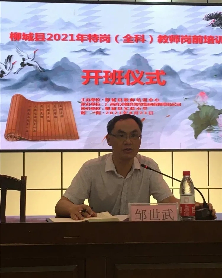 柳城縣教師培訓(xùn)中心主任鄒世武在講話中闡述了培訓(xùn)的意義及要求,希望學(xué)員通過(guò)培訓(xùn)快速提升自己,成為教師隊(duì)伍的骨干力量。