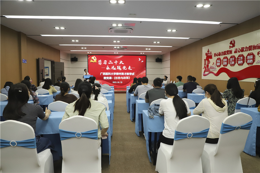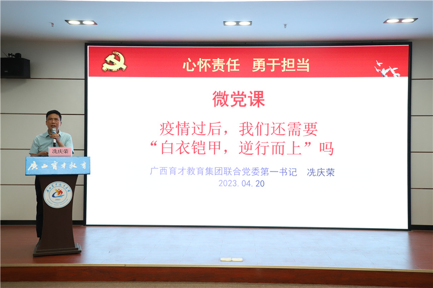 學習二十大,永遠跟黨走。開學典禮前,柳州市委組織部派駐集團黨委第一書記冼慶榮(原柳州市委黨校副校長)給學生黨員上了一堂《形勢與政策》思政課。冼書記的授課內容豐富、圖文并茂,結合醫(yī)學類學生的工作特點及生活中的案例,給學生講授了一場精彩別開生面的思政課,課上學生也踴躍的發(fā)表了個人的看法和感想。