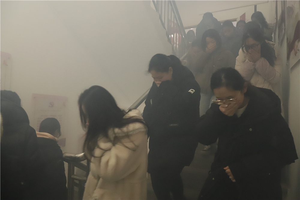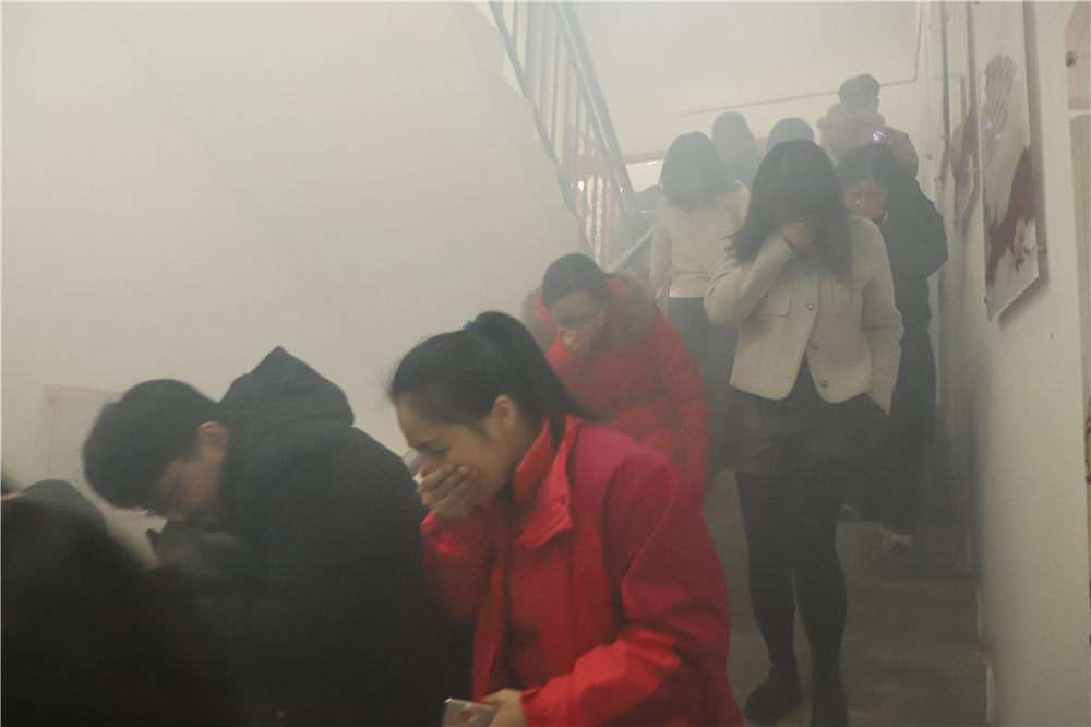 逃生疏散演練環(huán)節(jié)中,樓梯走道到處“濃煙滾滾”,伴隨著刺耳的警報(bào),參訓(xùn)教職工在教官的指揮下,捂住口鼻,靠墻彎腰,穿過模擬火災(zāi)煙霧場所,快速有序撤離到安全地帶。