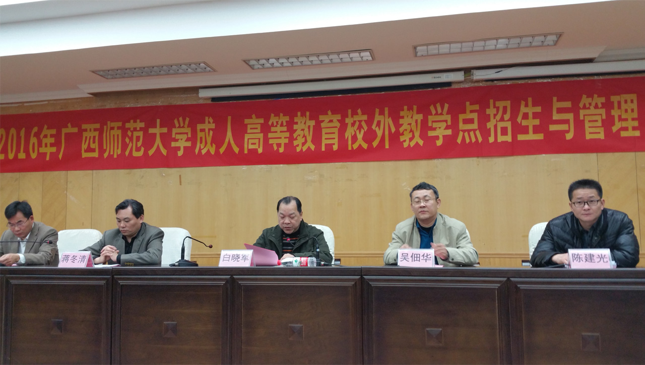 3月30日上午,2016年廣西師范大學(xué)成人高等教育校外教學(xué)點(diǎn)招生與管理工作會(huì)議在廣西師范大學(xué)育才校區(qū)隆重召開(kāi)。廣西師范大學(xué)白曉軍副校長(zhǎng)出席會(huì)議并做重要講話,會(huì)議由廣西師范大學(xué)成教院吳佃華院長(zhǎng)主持。