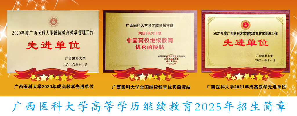 廣西醫(yī)科大學繼續(xù)教育學院始建于1959年,辦學經(jīng)驗豐富、師資力量雄厚、教學管理規(guī)范。學院曾被教育部、教育廳分別授予“高等教育自學考試工作先進單位”、“成人高等教育評估優(yōu)秀學?!钡确Q號。學院現(xiàn)有自學考試、成人業(yè)余班等多種辦學形式。學生凡修完全部教學計劃課程,經(jīng)考核合格者,科獲得學校頒發(fā)的畢業(yè)證書,證書由教育部統(tǒng)一網(wǎng)上備案,國家承認學歷; 符合學位授予條件的本科畢業(yè)生,可獲得學士學位。為了方便廣大學生就近上學,學校在全區(qū)各地開設有教學點,開展送教上門服務。